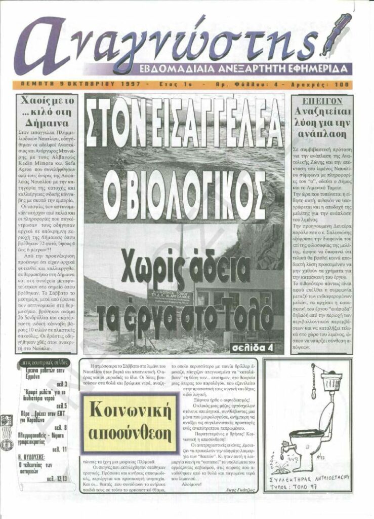 To Τεύχος 4 της εβδομαδιαίας εφημερίδας Αναγνώστης Πελοποννήσου με έδρα το Ναύπλιο του Νομού Αργολίδας που εκδόθηκε και κυκλοφόρησε την Πέμπτη 9 Οκτωβρίου 1997