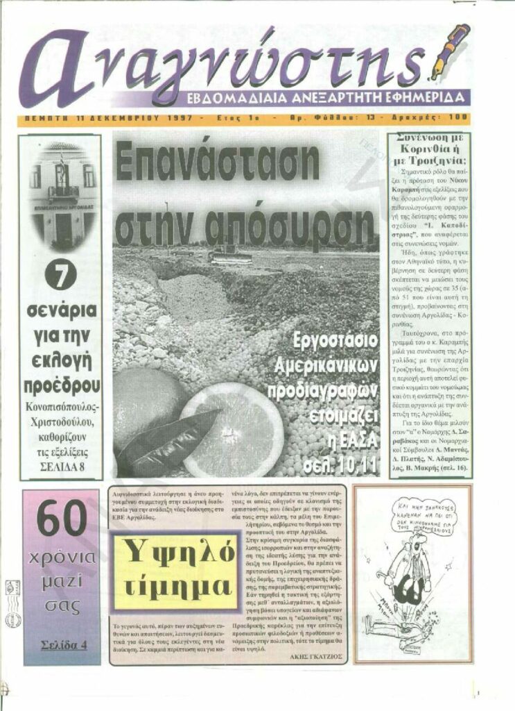 To Τεύχος 13 της εβδομαδιαίας εφημερίδας Αναγνώστης Πελοποννήσου με έδρα το Ναύπλιο του Νομού Αργολίδας που εκδόθηκε και κυκλοφόρησε την Πέμπτη 11 Δεκεμβρίου 1997