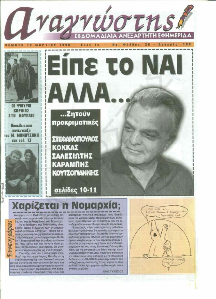 To Τεύχος 26 της εβδομαδιαίας εφημερίδας Αναγνώστης Πελοποννήσου με έδρα το Ναύπλιο του Νομού Αργολίδας που εκδόθηκε και κυκλοφόρησε την Πέμπτη 12 Μαρτίου 1998