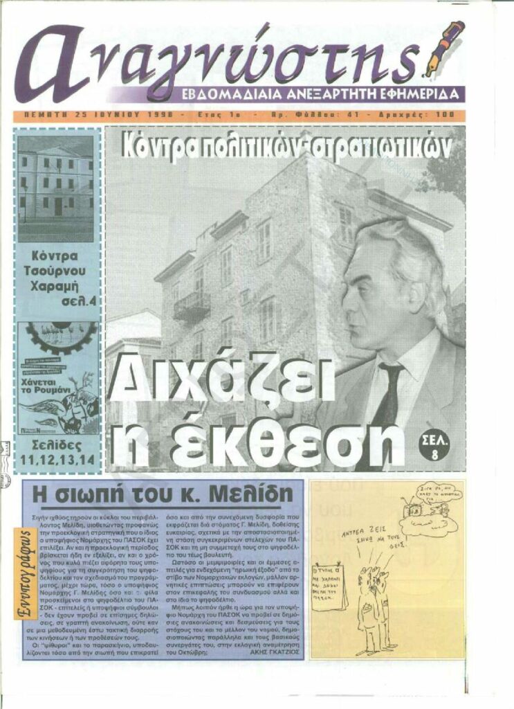 To Τεύχος 41 της εβδομαδιαίας εφημερίδας Αναγνώστης Πελοποννήσου με έδρα το Ναύπλιο του Νομού Αργολίδας που εκδόθηκε και κυκλοφόρησε την Πέμπτη 25 Ιουνίου 1998
