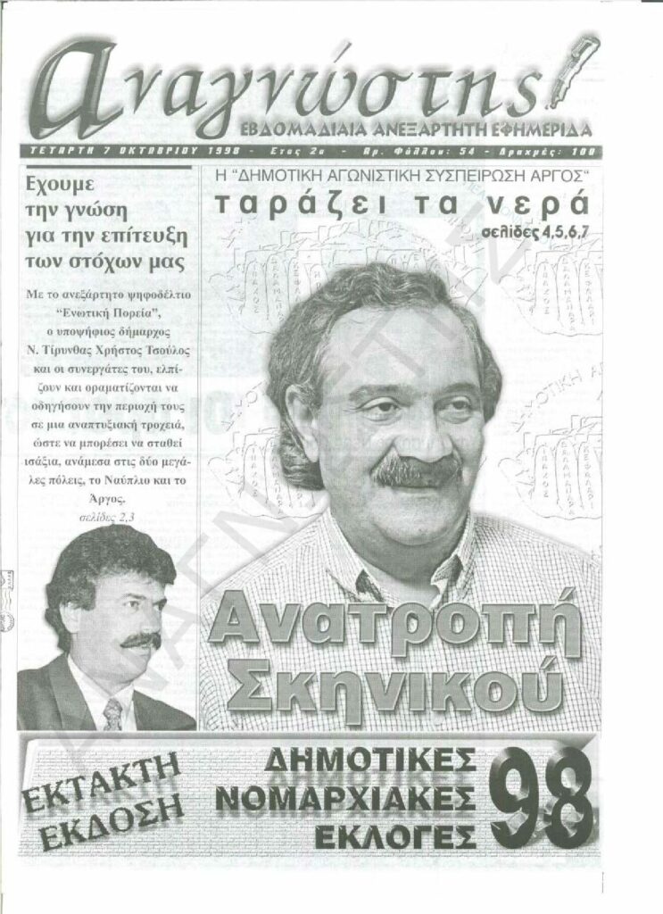 To Τεύχος 54 της εβδομαδιαίας εφημερίδας Αναγνώστης Πελοποννήσου με έδρα το Ναύπλιο του Νομού Αργολίδας που εκδόθηκε και κυκλοφόρησε την Πέμπτη 7 Οκτωβρίου 1998