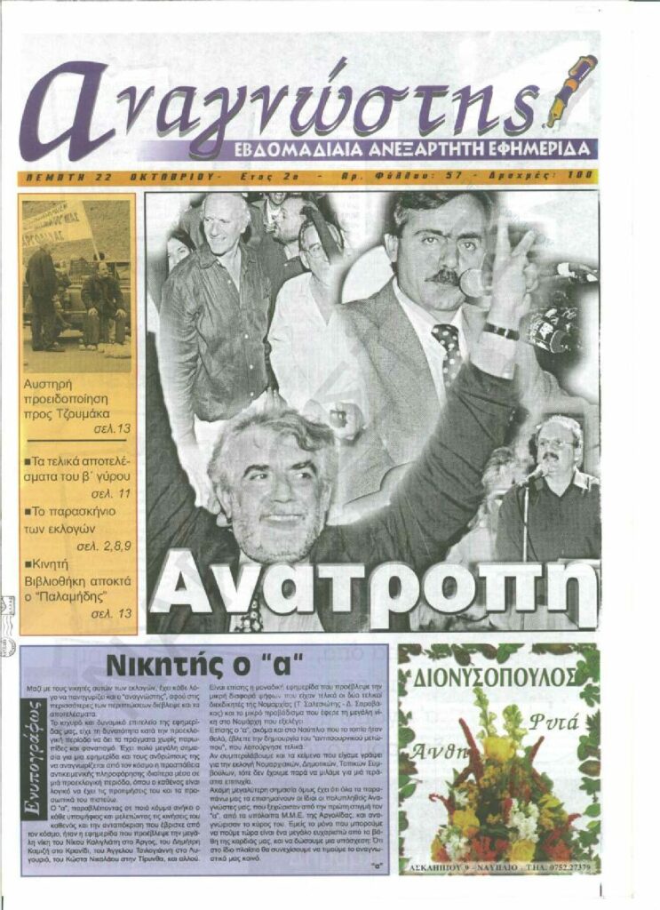 To Τεύχος 57 της εβδομαδιαίας εφημερίδας Αναγνώστης Πελοποννήσου με έδρα το Ναύπλιο του Νομού Αργολίδας που εκδόθηκε και κυκλοφόρησε την Πέμπτη 22 Οκτωβρίου 1998
