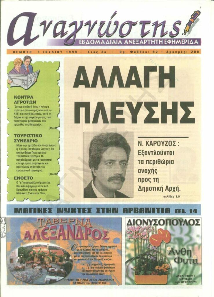 To Τεύχος 92 της εβδομαδιαίας εφημερίδας Αναγνώστης Πελοποννήσου με έδρα το Ναύπλιο του Νομού Αργολίδας που εκδόθηκε και κυκλοφόρησε την Πέμπτη 1 Ιουλίου 1999
