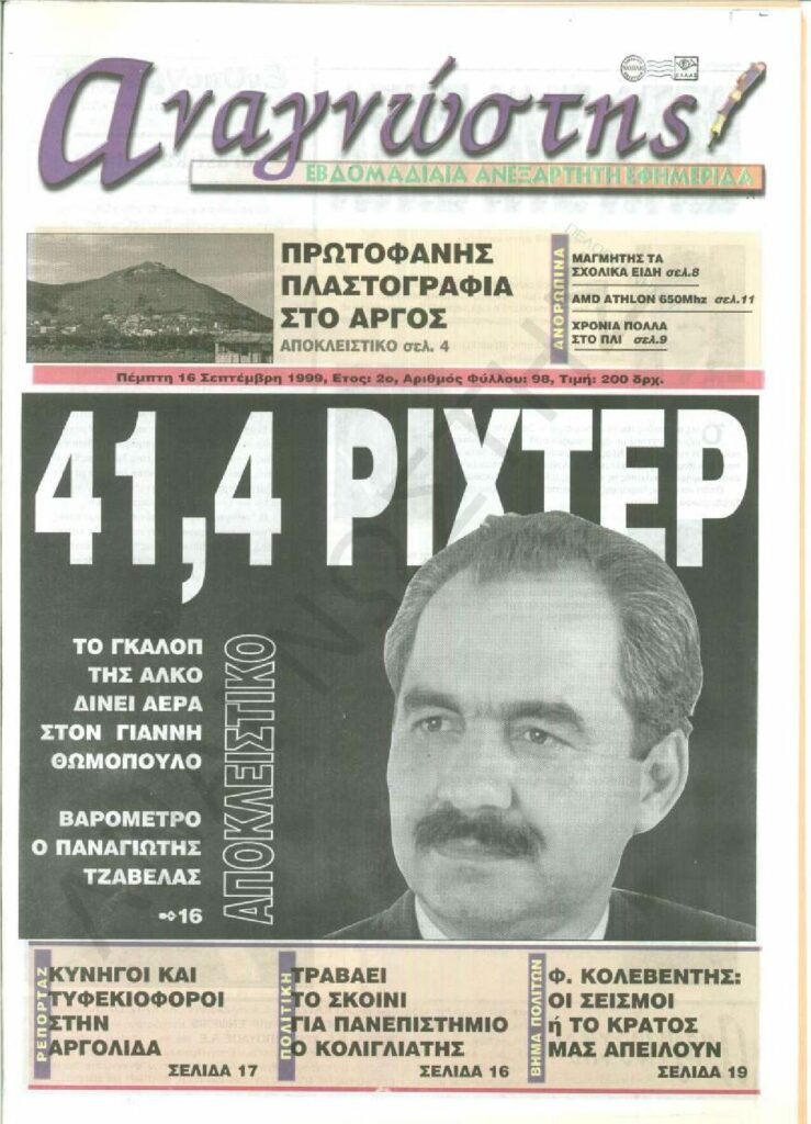 To Τεύχος 98 της εβδομαδιαίας εφημερίδας Αναγνώστης Πελοποννήσου με έδρα το Ναύπλιο του Νομού Αργολίδας που εκδόθηκε και κυκλοφόρησε την Πέμπτη 16 Σεπτεμβρίου 1999