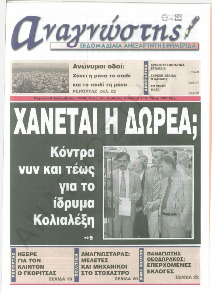To Τεύχος 110 της εβδομαδιαίας εφημερίδας Αναγνώστης Πελοποννήσου με έδρα το Ναύπλιο του Νομού Αργολίδας που εκδόθηκε και κυκλοφόρησε την Πέμπτη 9 Δεκεμβρίου 1999