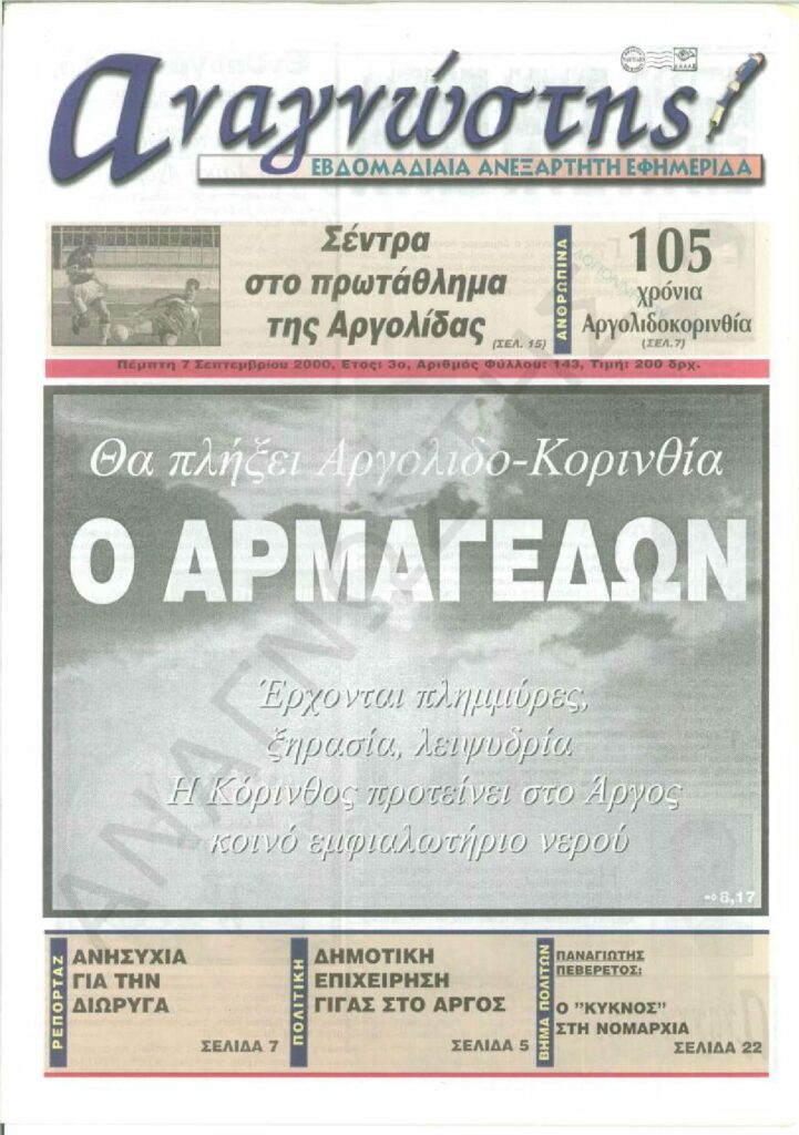 To Τεύχος 143 της εβδομαδιαίας εφημερίδας Αναγνώστης Πελοποννήσου με έδρα το Ναύπλιο του Νομού Αργολίδας που εκδόθηκε και κυκλοφόρησε την Πέμπτη 7 Σεπτεμβρίου 2000