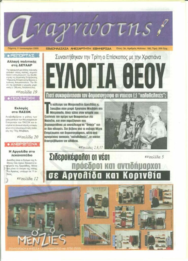 To Τεύχος 160 της εβδομαδιαίας εφημερίδας Αναγνώστης Πελοποννήσου με έδρα το Ναύπλιο του Νομού Αργολίδας που εκδόθηκε και κυκλοφόρησε την Πέμπτη 11 Ιανουαρίου 2001