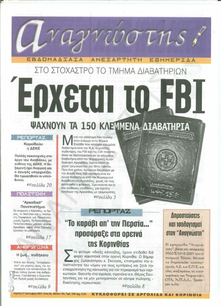 To Τεύχος 194 της εβδομαδιαίας εφημερίδας Αναγνώστης Πελοποννήσου με έδρα το Ναύπλιο του Νομού Αργολίδας που εκδόθηκε και κυκλοφόρησε την Πέμπτη 27 Σεπτεμβρίου 2001