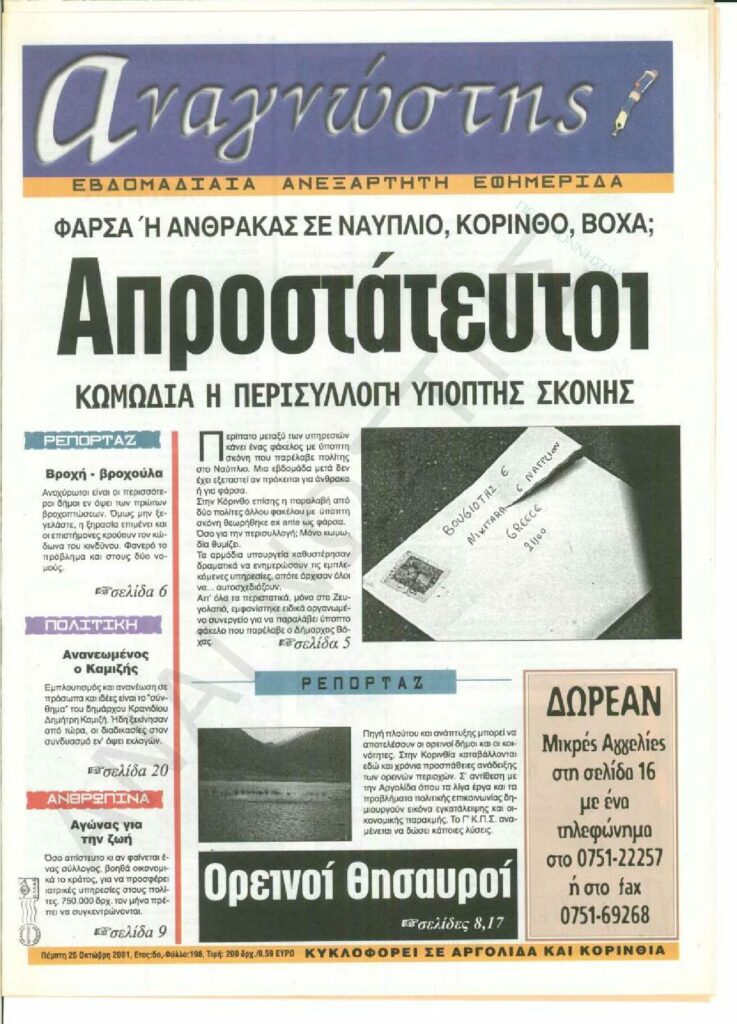 To Τεύχος 198 της εβδομαδιαίας εφημερίδας Αναγνώστης Πελοποννήσου με έδρα το Ναύπλιο του Νομού Αργολίδας που εκδόθηκε και κυκλοφόρησε την Πέμπτη 25 Οκτωβρίου 2001