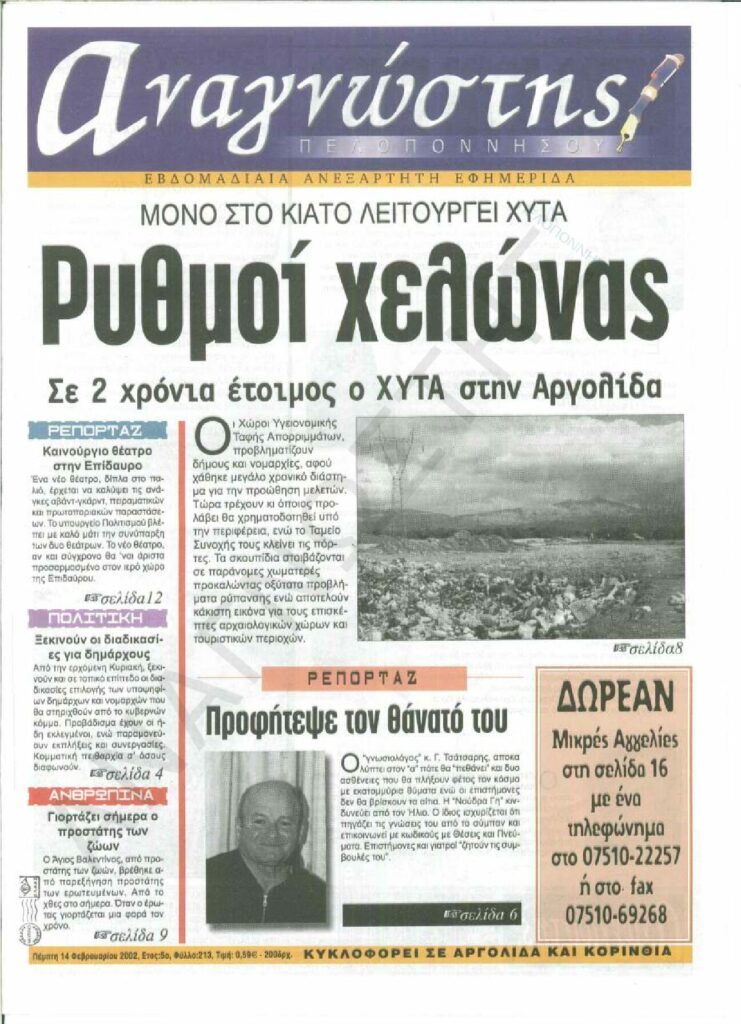 To Τεύχος 213 της εβδομαδιαίας εφημερίδας Αναγνώστης Πελοποννήσου με έδρα το Ναύπλιο του Νομού Αργολίδας που εκδόθηκε και κυκλοφόρησε την Πέμπτη 14 Φεβρουαρίου 2002