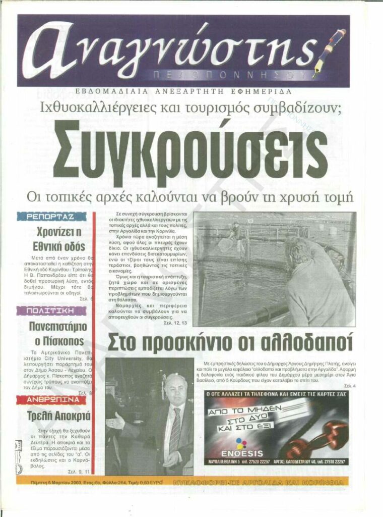 To Τεύχος 264 της εβδομαδιαίας εφημερίδας Αναγνώστης Πελοποννήσου με έδρα το Ναύπλιο του Νομού Αργολίδας που εκδόθηκε και κυκλοφόρησε την Πέμπτη 6 Μαρτίου 2003