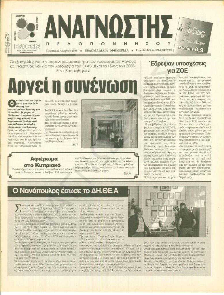 To Τεύχος 321 της εβδομαδιαίας εφημερίδας Αναγνώστης Πελοποννήσου με έδρα το Ναύπλιο του Νομού Αργολίδας που εκδόθηκε και κυκλοφόρησε την Πέμπτη 22 Απριλίου 2004
