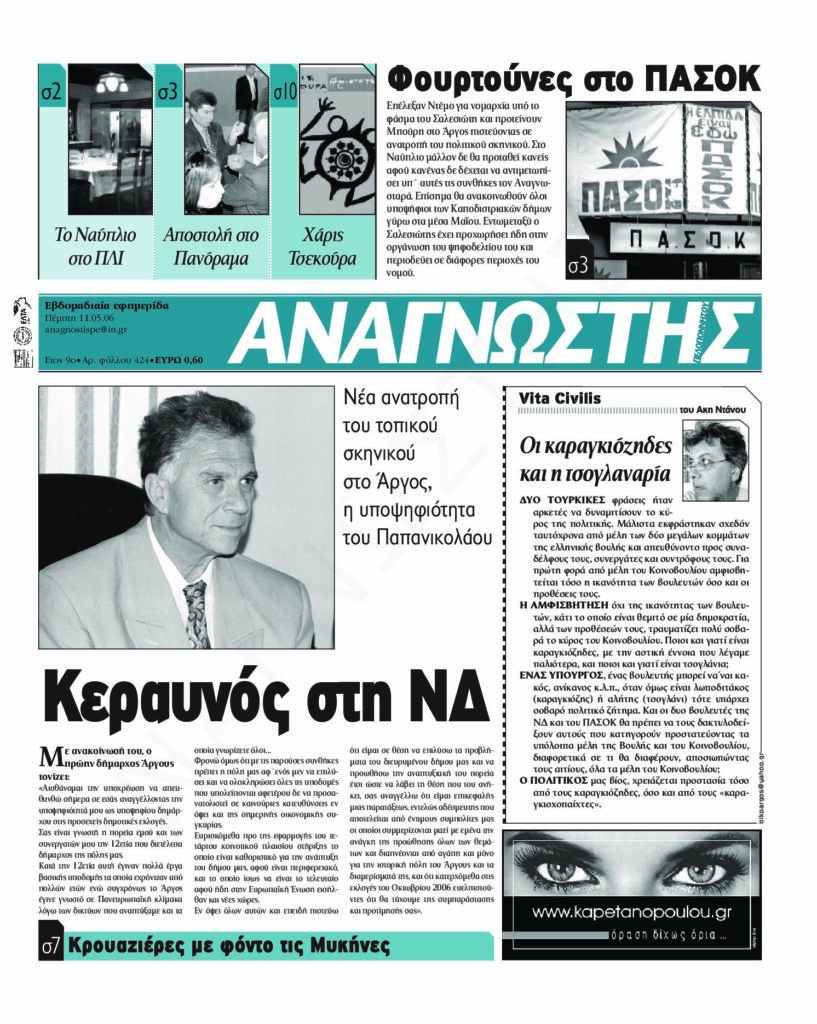To Τεύχος 424 της εβδομαδιαίας εφημερίδας Αναγνώστης Πελοποννήσου με έδρα το Ναύπλιο του Νομού Αργολίδας που εκδόθηκε και κυκλοφόρησε την Πέμπτη 11 Μαΐου 2006