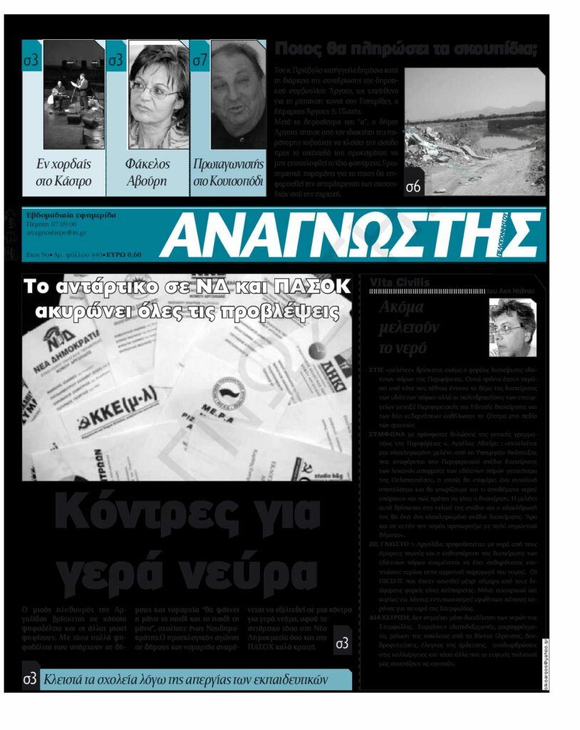 To Τεύχος 440 της εβδομαδιαίας εφημερίδας Αναγνώστης Πελοποννήσου με έδρα το Ναύπλιο του Νομού Αργολίδας που εκδόθηκε και κυκλοφόρησε την Πέμπτη 7 Σεπτεμβρίου 2006