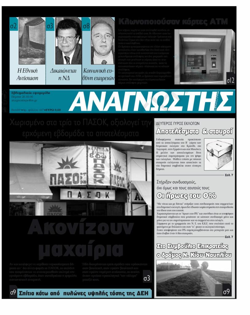 To Τεύχος 447 της εβδομαδιαίας εφημερίδας Αναγνώστης Πελοποννήσου με έδρα το Ναύπλιο του Νομού Αργολίδας που εκδόθηκε και κυκλοφόρησε την Πέμπτη 26 Οκτωβρίου 2006