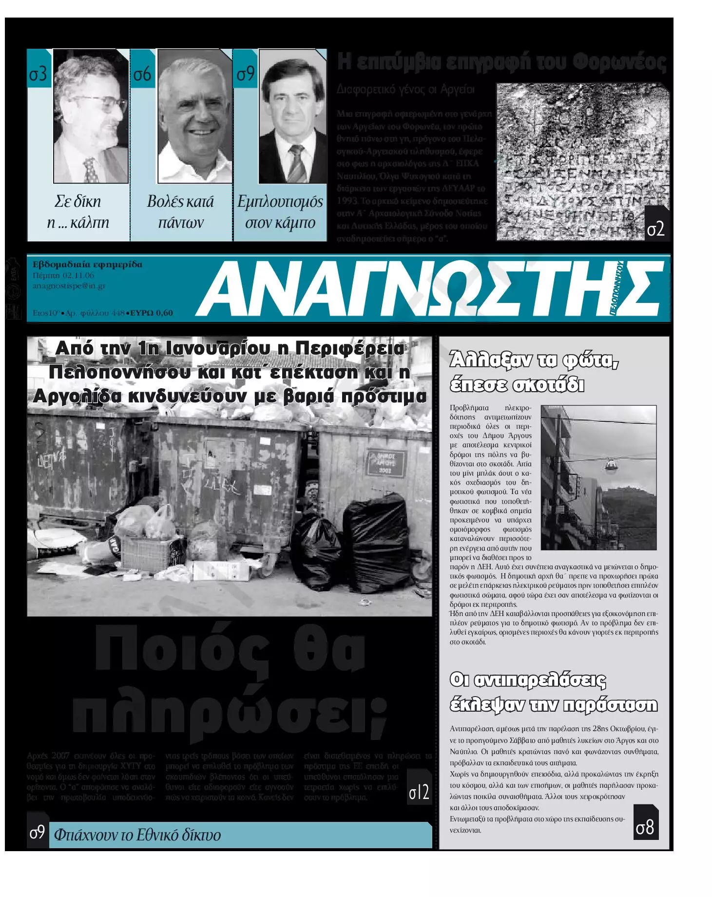 To Τεύχος 448 της εβδομαδιαίας εφημερίδας Αναγνώστης Πελοποννήσου με έδρα το Ναύπλιο του Νομού Αργολίδας που εκδόθηκε και κυκλοφόρησε την Πέμπτη 2 Νοεμβρίου 2006