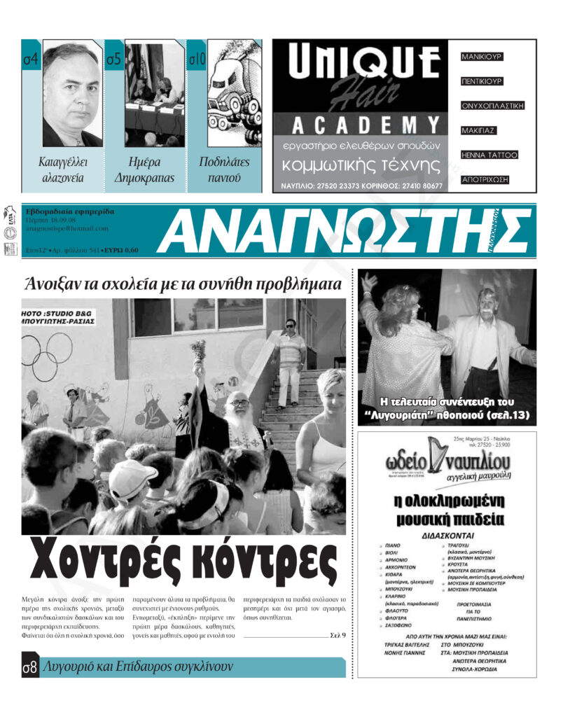 To Τεύχος 541 της εβδομαδιαίας εφημερίδας Αναγνώστης Πελοποννήσου με έδρα το Ναύπλιο του Νομού Αργολίδας που εκδόθηκε και κυκλοφόρησε την Πέμπτη 18 Σεπτεμβρίου 2008