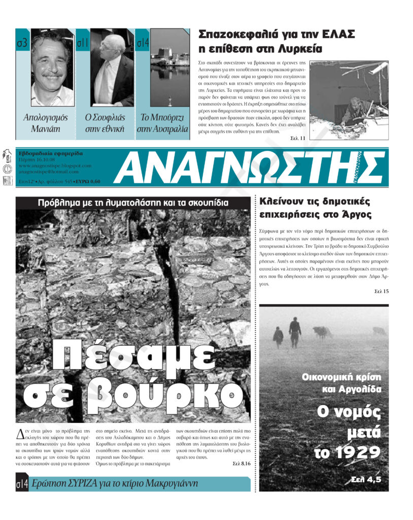 To Τεύχος 545 της εβδομαδιαίας εφημερίδας Αναγνώστης Πελοποννήσου με έδρα το Ναύπλιο του Νομού Αργολίδας που εκδόθηκε και κυκλοφόρησε την Πέμπτη 16 Οκτωβρίου 2008