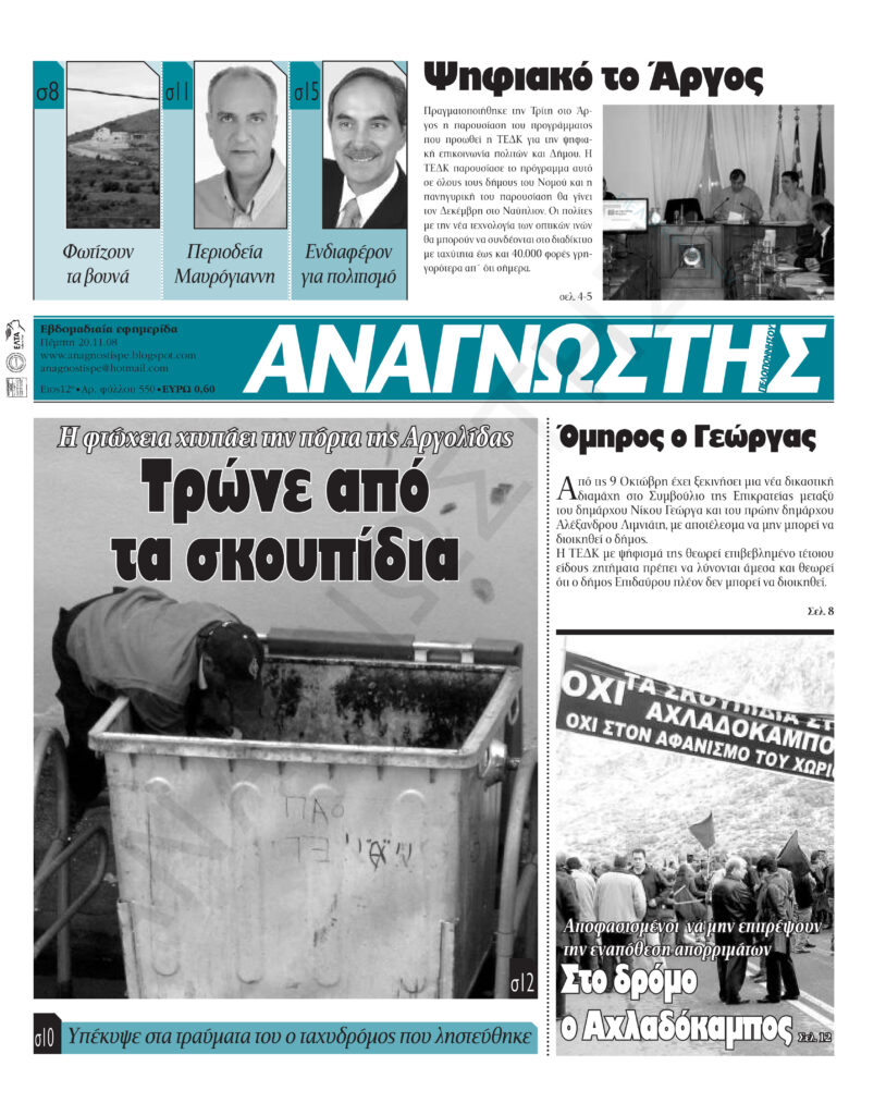 To Τεύχος 550 της εβδομαδιαίας εφημερίδας Αναγνώστης Πελοποννήσου με έδρα το Ναύπλιο του Νομού Αργολίδας που εκδόθηκε και κυκλοφόρησε την Πέμπτη 20 Νοεμβρίου 2008