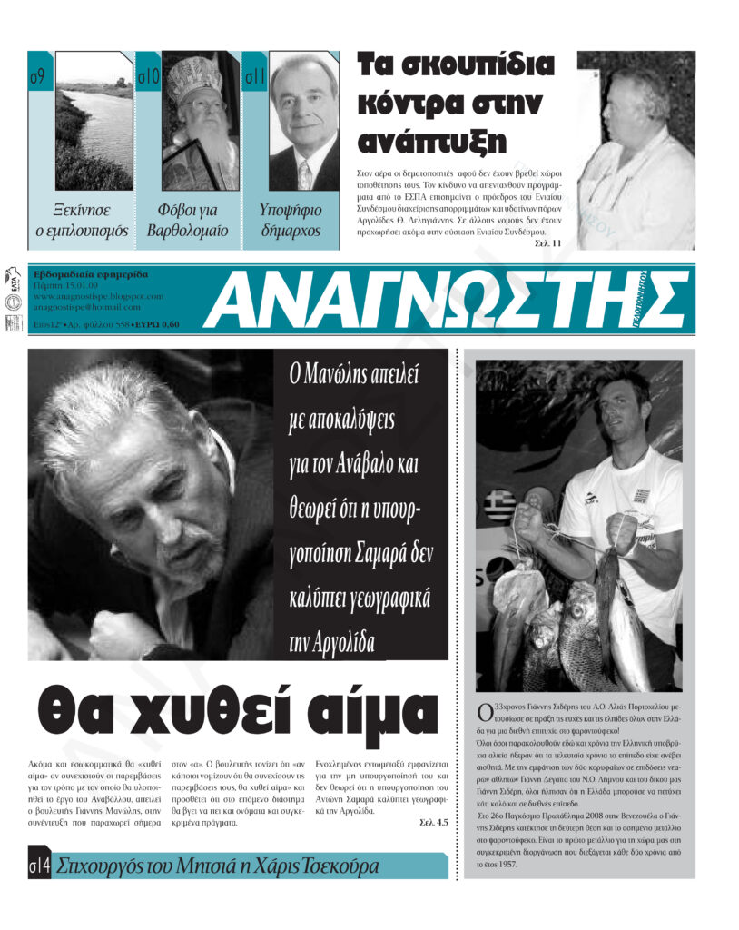 To Τεύχος 558 της εβδομαδιαίας εφημερίδας Αναγνώστης Πελοποννήσου με έδρα το Ναύπλιο του Νομού Αργολίδας που εκδόθηκε και κυκλοφόρησε την Πέμπτη 15 Ιανουαρίου 2009