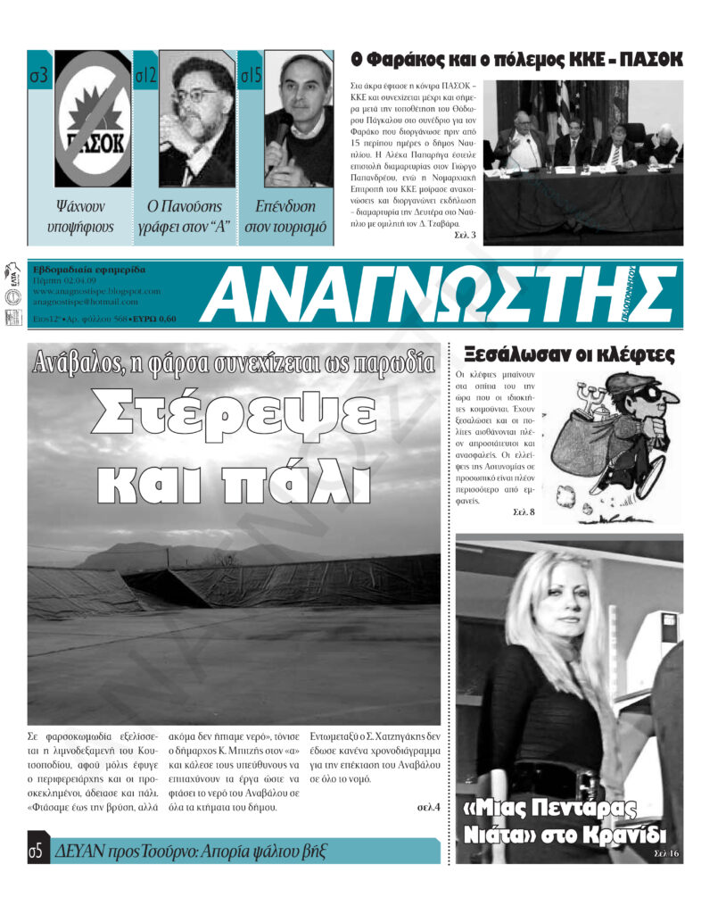 To Τεύχος 568 της εβδομαδιαίας εφημερίδας Αναγνώστης Πελοποννήσου με έδρα το Ναύπλιο του Νομού Αργολίδας που εκδόθηκε και κυκλοφόρησε την Πέμπτη 2 Απριλίου 2009