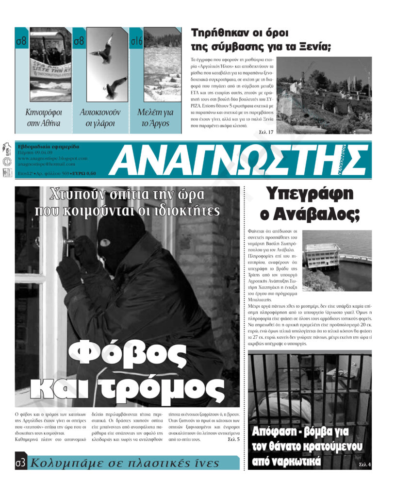To Τεύχος 569 της εβδομαδιαίας εφημερίδας Αναγνώστης Πελοποννήσου με έδρα το Ναύπλιο του Νομού Αργολίδας που εκδόθηκε και κυκλοφόρησε την Πέμπτη 9 Απριλίου 2009