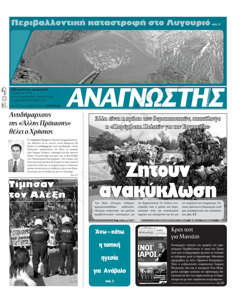To Τεύχος 601 της εβδομαδιαίας εφημερίδας Αναγνώστης Πελοποννήσου με έδρα το Ναύπλιο του Νομού Αργολίδας που εκδόθηκε και κυκλοφόρησε την Πέμπτη 10 Δεκεμβρίου 2009