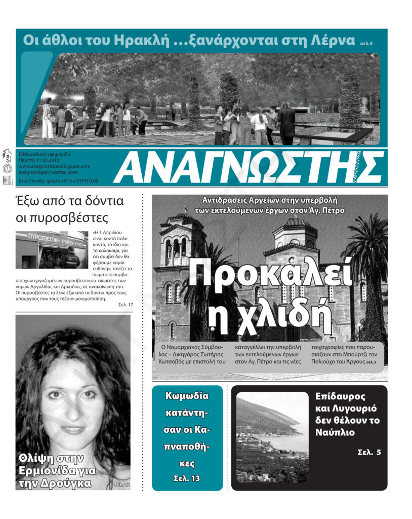 To Τεύχος 613 της εβδομαδιαίας εφημερίδας Αναγνώστης Πελοποννήσου με έδρα το Ναύπλιο του Νομού Αργολίδας που εκδόθηκε και κυκλοφόρησε την Πέμπτη 11 Μαρτίου 2010