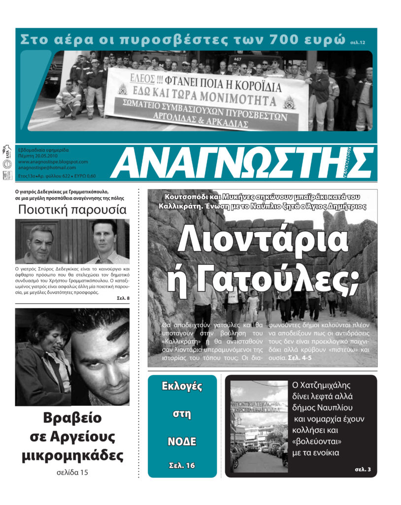 To Τεύχος 622 της εβδομαδιαίας εφημερίδας Αναγνώστης Πελοποννήσου με έδρα το Ναύπλιο του Νομού Αργολίδας που εκδόθηκε και κυκλοφόρησε την Πέμπτη 20 Μαΐου 2010