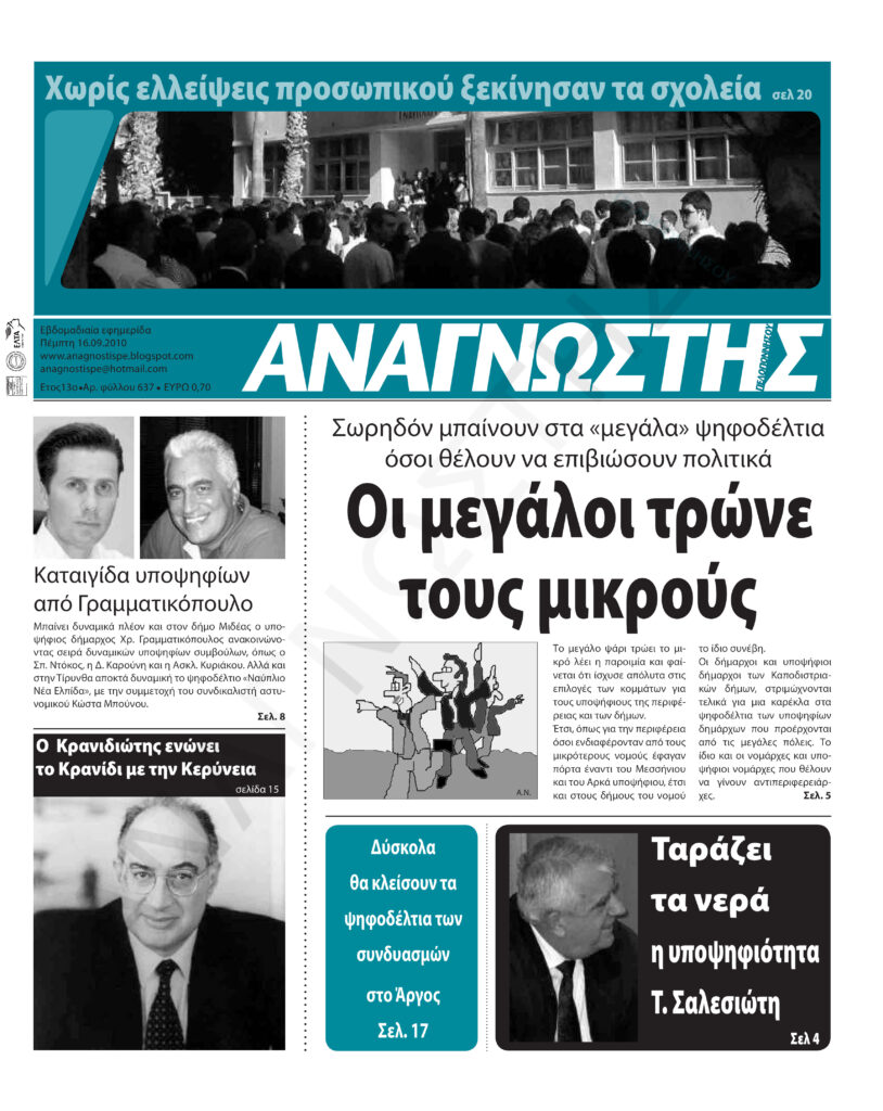 To Τεύχος 637 της εβδομαδιαίας εφημερίδας Αναγνώστης Πελοποννήσου με έδρα το Ναύπλιο του Νομού Αργολίδας που εκδόθηκε και κυκλοφόρησε την Πέμπτη 16 Σεπτεμβρίου 2010