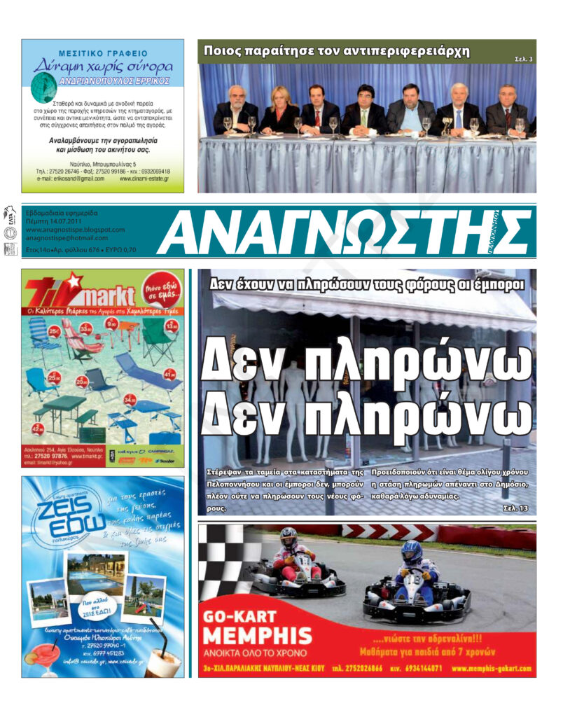 To Τεύχος 676 της εβδομαδιαίας εφημερίδας Αναγνώστης Πελοποννήσου με έδρα το Ναύπλιο του Νομού Αργολίδας που εκδόθηκε και κυκλοφόρησε την Πέμπτη 14 Ιουλίου 2011