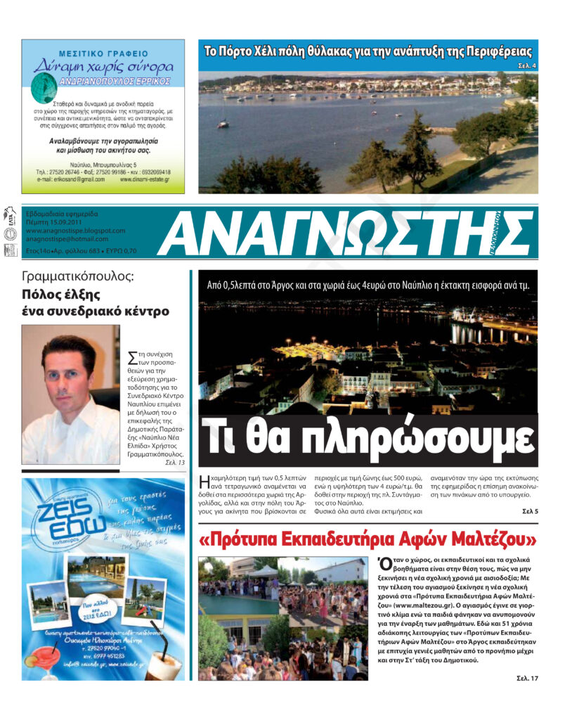 To Τεύχος 683 της εβδομαδιαίας εφημερίδας Αναγνώστης Πελοποννήσου με έδρα το Ναύπλιο του Νομού Αργολίδας που εκδόθηκε και κυκλοφόρησε την Πέμπτη 15 Σεπτεμβρίου 2011
