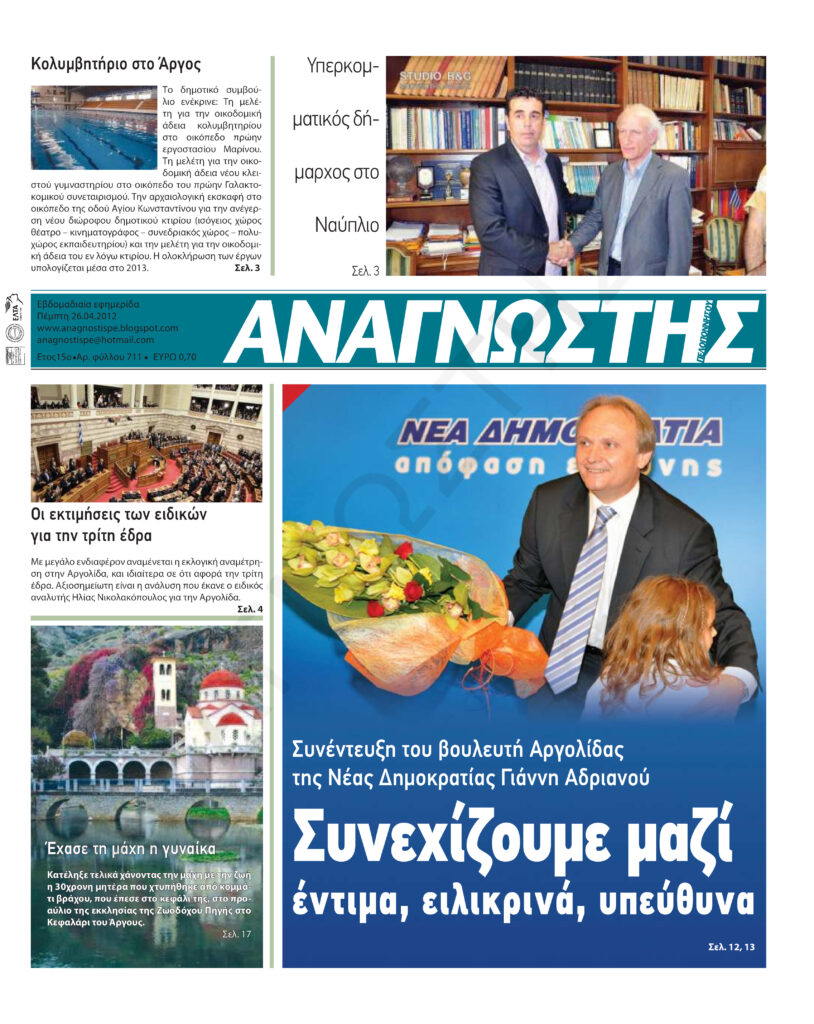 To Τεύχος 711 της εβδομαδιαίας εφημερίδας Αναγνώστης Πελοποννήσου με έδρα το Ναύπλιο του Νομού Αργολίδας που εκδόθηκε και κυκλοφόρησε την Πέμπτη 26 Απριλίου 2012
