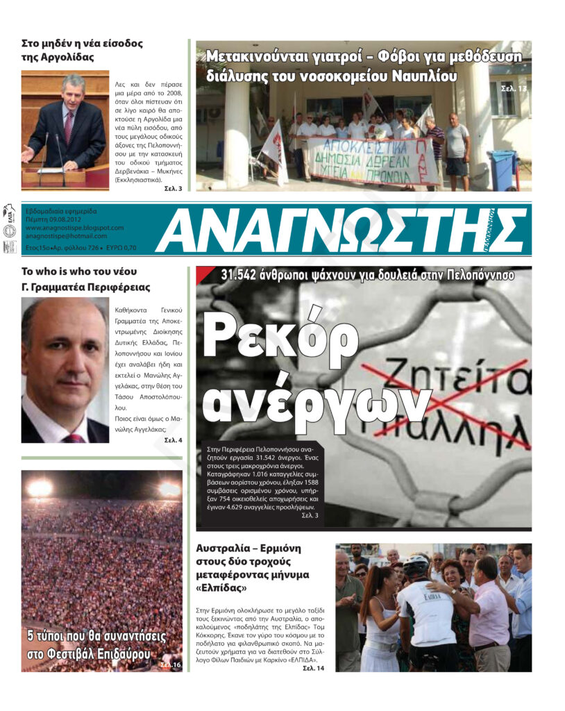 To Τεύχος 726 της εβδομαδιαίας εφημερίδας Αναγνώστης Πελοποννήσου με έδρα το Ναύπλιο του Νομού Αργολίδας που εκδόθηκε και κυκλοφόρησε την Πέμπτη 9 Αυγούστου 2012