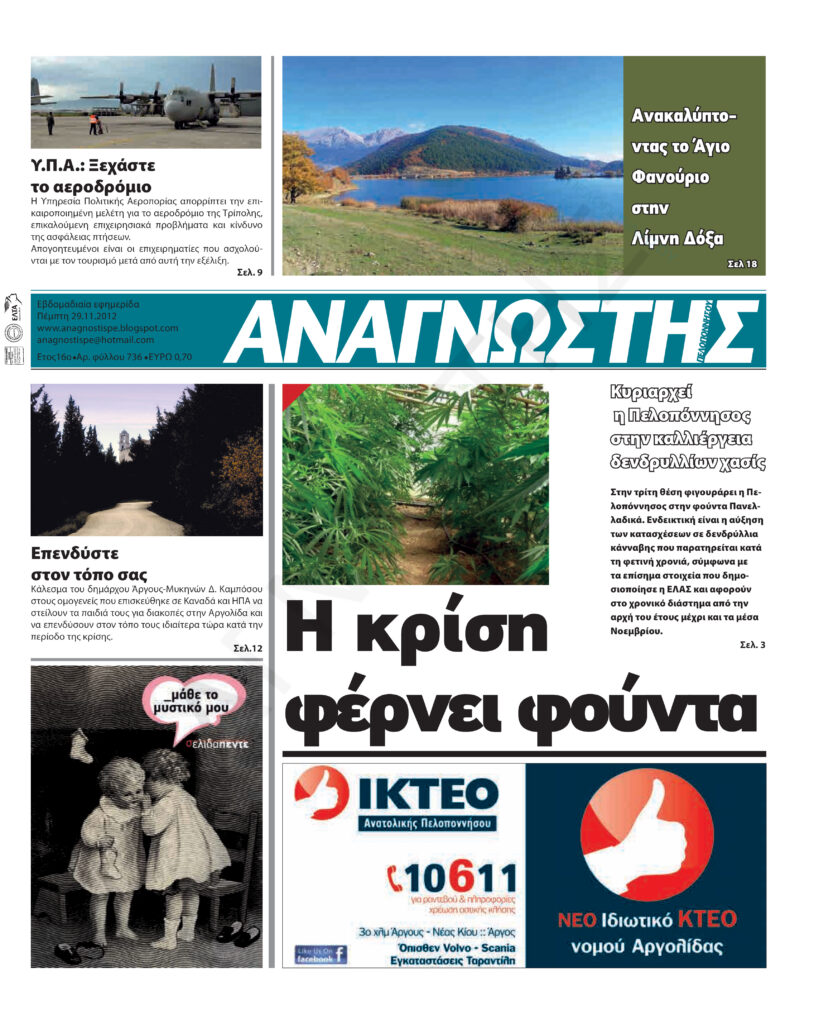 To Τεύχος 736 της εβδομαδιαίας εφημερίδας Αναγνώστης Πελοποννήσου με έδρα το Ναύπλιο του Νομού Αργολίδας που εκδόθηκε και κυκλοφόρησε την Πέμπτη 29 Νοεμβρίου 2012