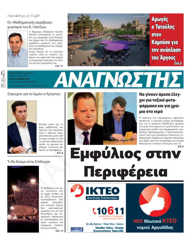 To Τεύχος 759 της εβδομαδιαίας εφημερίδας Αναγνώστης Πελοποννήσου με έδρα το Ναύπλιο του Νομού Αργολίδας που εκδόθηκε και κυκλοφόρησε την Πέμπτη 23 Μαΐου 2013