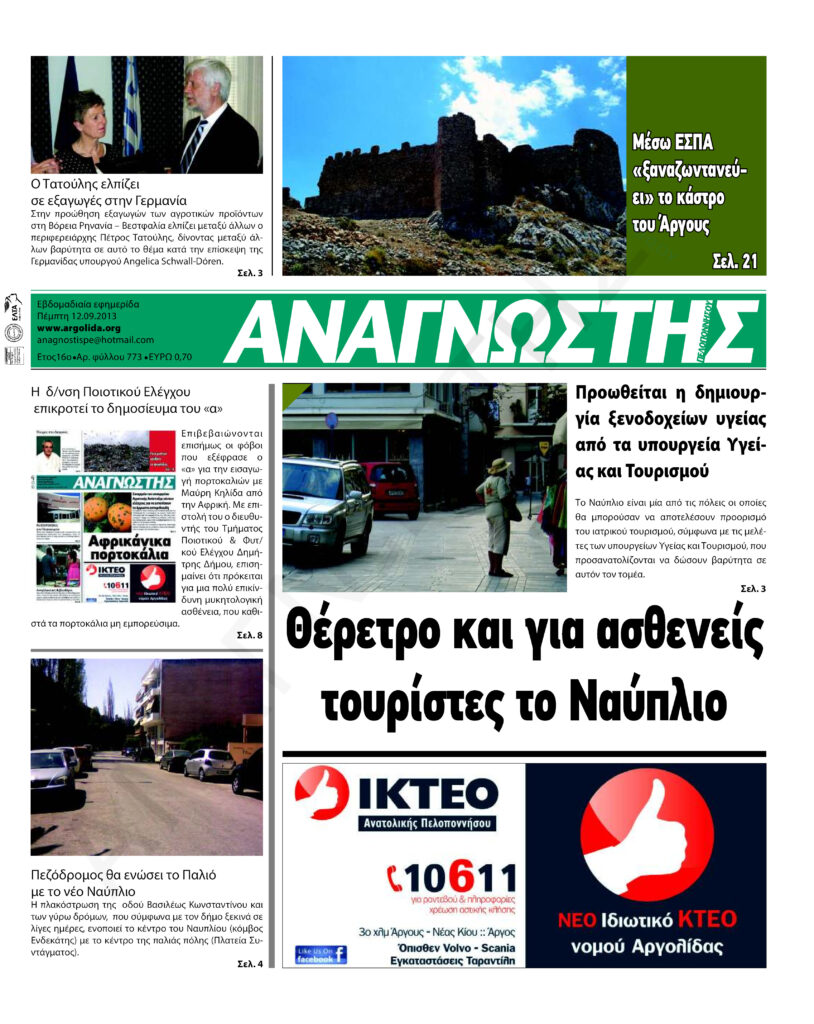 To Τεύχος 773 της εβδομαδιαίας εφημερίδας Αναγνώστης Πελοποννήσου με έδρα το Ναύπλιο του Νομού Αργολίδας που εκδόθηκε και κυκλοφόρησε την Πέμπτη 12 Σεπτεμβρίου 2013