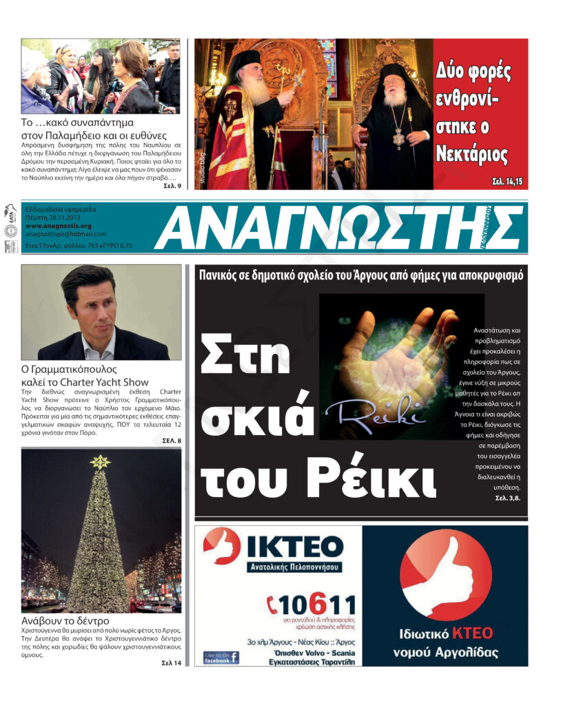 To Τεύχος 783 της εβδομαδιαίας εφημερίδας Αναγνώστης Πελοποννήσου με έδρα το Ναύπλιο του Νομού Αργολίδας που εκδόθηκε και κυκλοφόρησε την Πέμπτη 28 Νοεμβρίου 2013