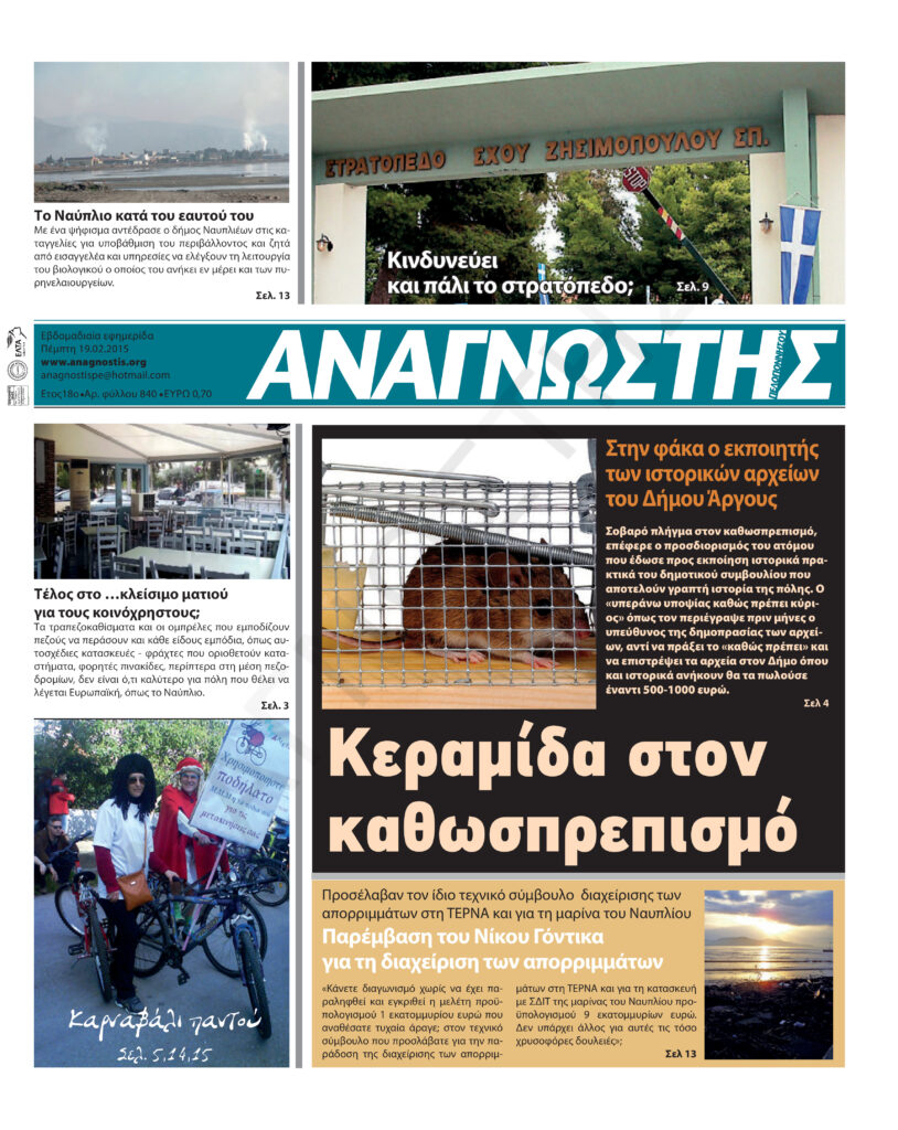 To Τεύχος 840 της εβδομαδιαίας εφημερίδας Αναγνώστης Πελοποννήσου με έδρα το Ναύπλιο του Νομού Αργολίδας που εκδόθηκε και κυκλοφόρησε την Πέμπτη 19 Φεβρουαρίου 2015