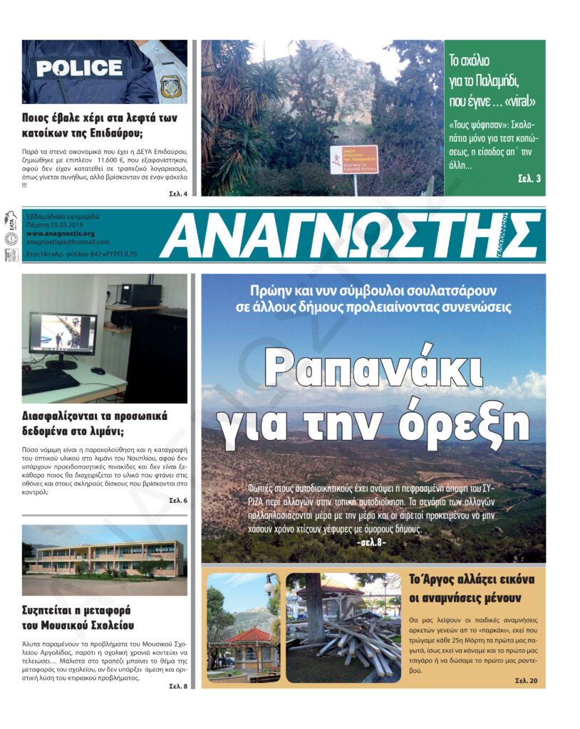 To Τεύχος 842 της εβδομαδιαίας εφημερίδας Αναγνώστης Πελοποννήσου με έδρα το Ναύπλιο του Νομού Αργολίδας που εκδόθηκε και κυκλοφόρησε την Πέμπτη 5 Μαρτίου 2015