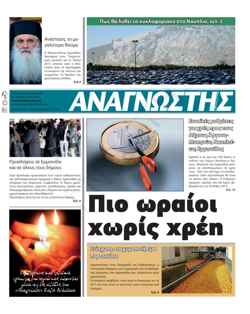 To Τεύχος 846 της εβδομαδιαίας εφημερίδας Αναγνώστης Πελοποννήσου με έδρα το Ναύπλιο του Νομού Αργολίδας που εκδόθηκε και κυκλοφόρησε την Πέμπτη 9 Απριλίου 2015