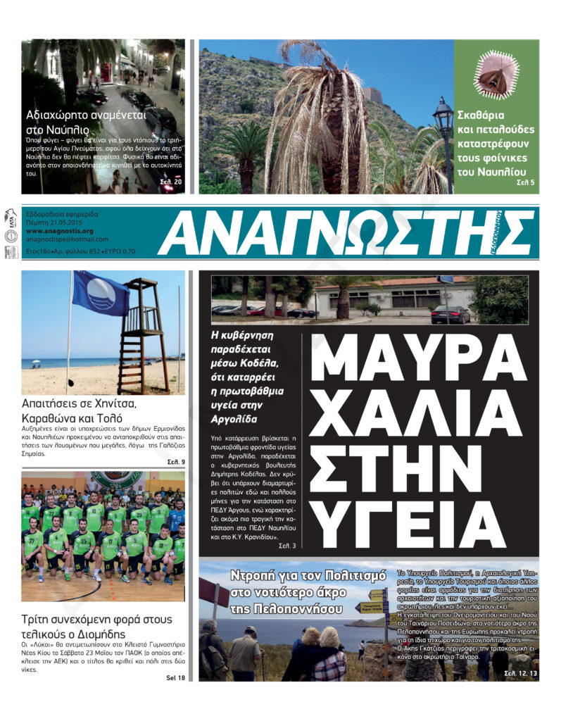 To Τεύχος 852 της εβδομαδιαίας εφημερίδας Αναγνώστης Πελοποννήσου με έδρα το Ναύπλιο του Νομού Αργολίδας που εκδόθηκε και κυκλοφόρησε την Πέμπτη 21 Μαΐου 2015