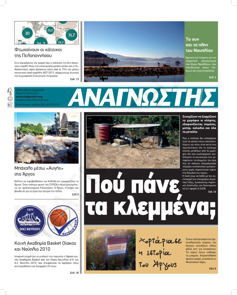 To Τεύχος 853 της εβδομαδιαίας εφημερίδας Αναγνώστης Πελοποννήσου με έδρα το Ναύπλιο του Νομού Αργολίδας που εκδόθηκε και κυκλοφόρησε την Πέμπτη 28 Μαΐου 2015