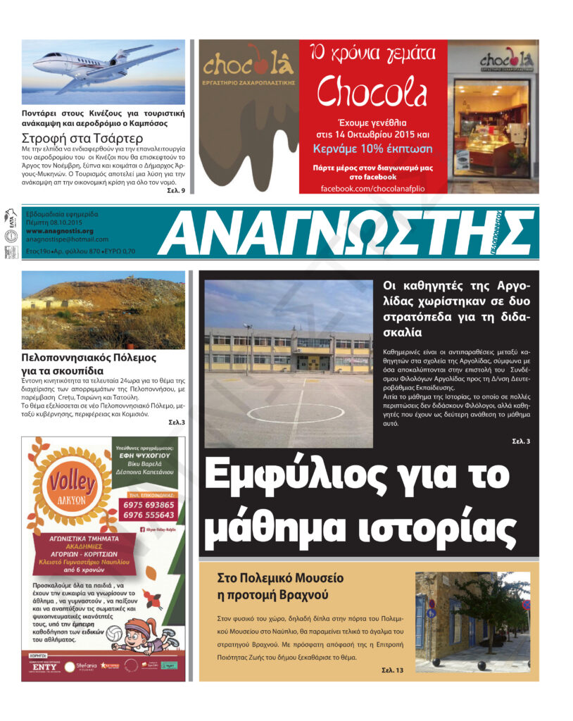 To Τεύχος 870 της εβδομαδιαίας εφημερίδας Αναγνώστης Πελοποννήσου με έδρα το Ναύπλιο του Νομού Αργολίδας που εκδόθηκε και κυκλοφόρησε την Πέμπτη 8 Οκτωβρίου 2015