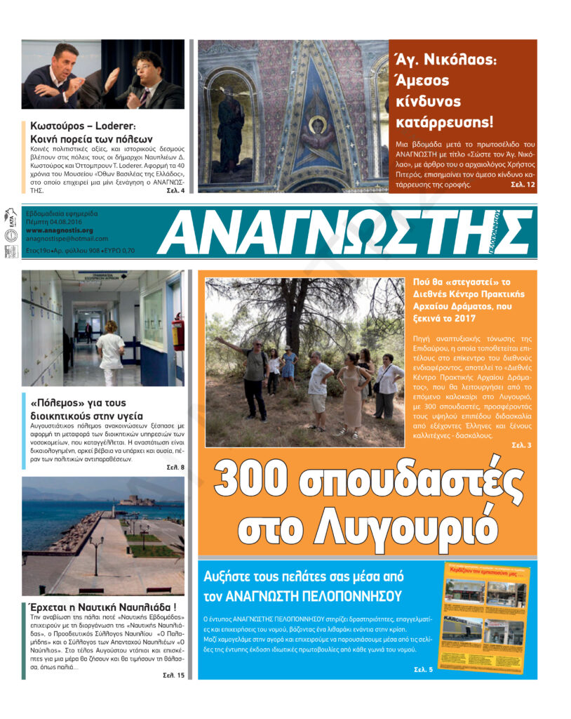 To Τεύχος 908 της εβδομαδιαίας εφημερίδας Αναγνώστης Πελοποννήσου με έδρα το Ναύπλιο του Νομού Αργολίδας που εκδόθηκε και κυκλοφόρησε την Πέμπτη 4 Αυγούστου 2016