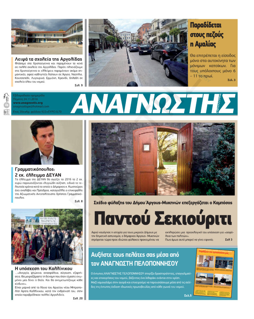 To Τεύχος 922 της εβδομαδιαίας εφημερίδας Αναγνώστης Πελοποννήσου με έδρα το Ναύπλιο του Νομού Αργολίδας που εκδόθηκε και κυκλοφόρησε την Πέμπτη 24 Νοεμβρίου 2016