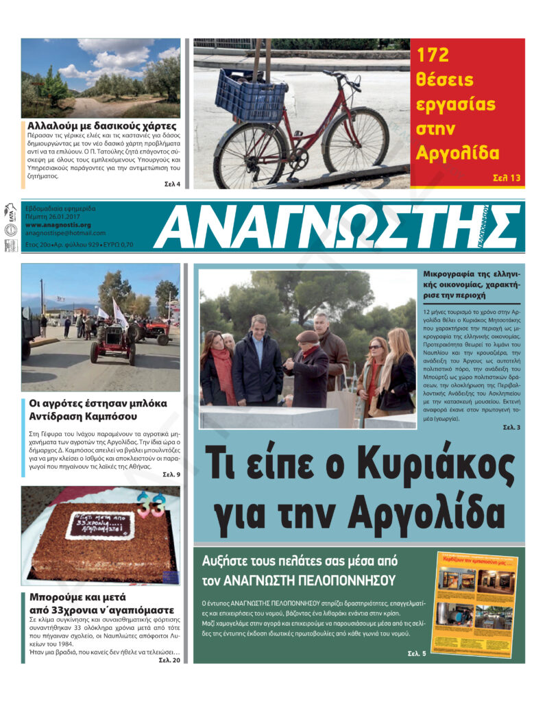 To Τεύχος 929 της εβδομαδιαίας εφημερίδας Αναγνώστης Πελοποννήσου με έδρα το Ναύπλιο του Νομού Αργολίδας που εκδόθηκε και κυκλοφόρησε την Πέμπτη 26 Ιανουαρίου 2017