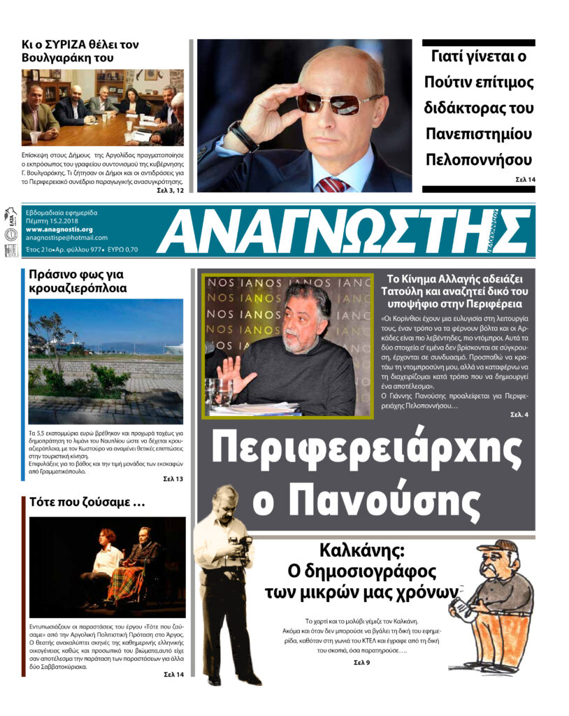 To Τεύχος 977 της εβδομαδιαίας εφημερίδας Αναγνώστης Πελοποννήσου με έδρα το Ναύπλιο του Νομού Αργολίδας που εκδόθηκε και κυκλοφόρησε την Πέμπτη 15 Φεβρουαρίου 2018