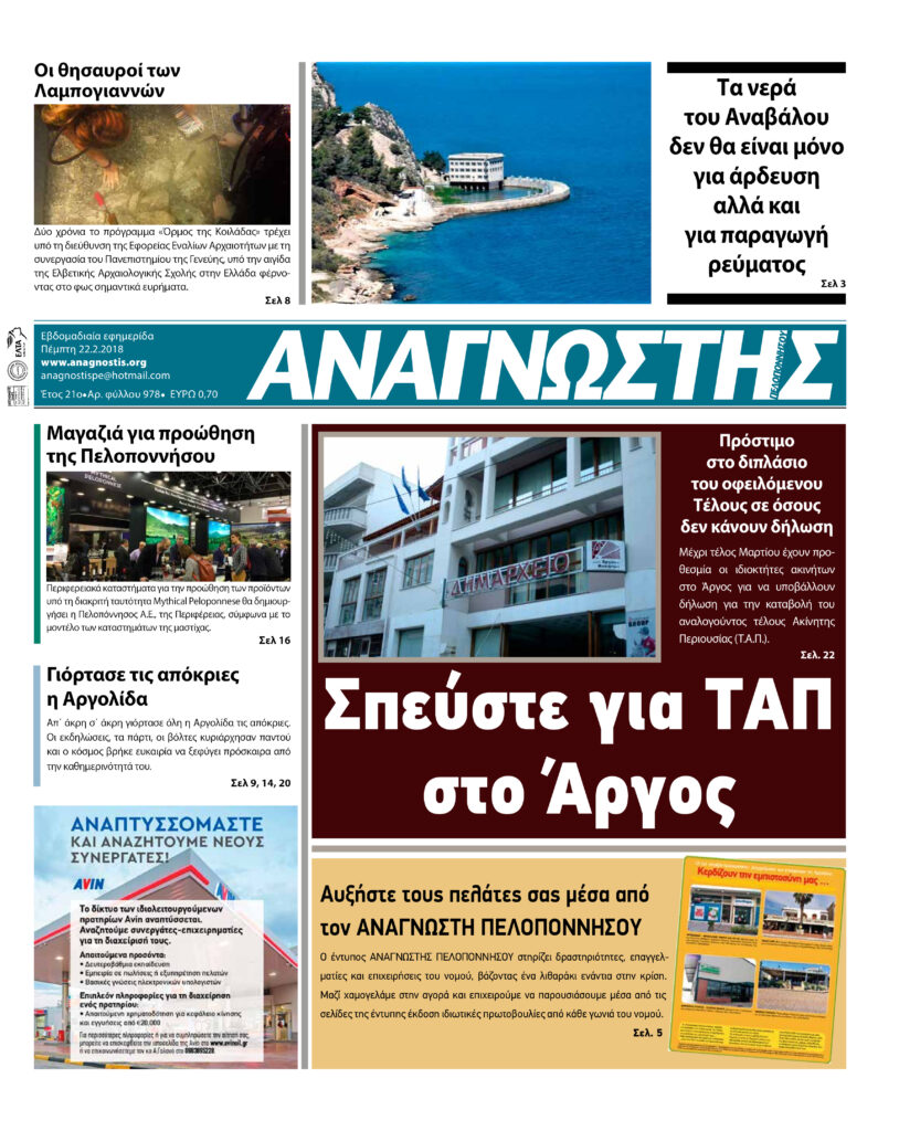 To Τεύχος 978 της εβδομαδιαίας εφημερίδας Αναγνώστης Πελοποννήσου με έδρα το Ναύπλιο του Νομού Αργολίδας που εκδόθηκε και κυκλοφόρησε την Πέμπτη 22 Φεβρουαρίου 2018