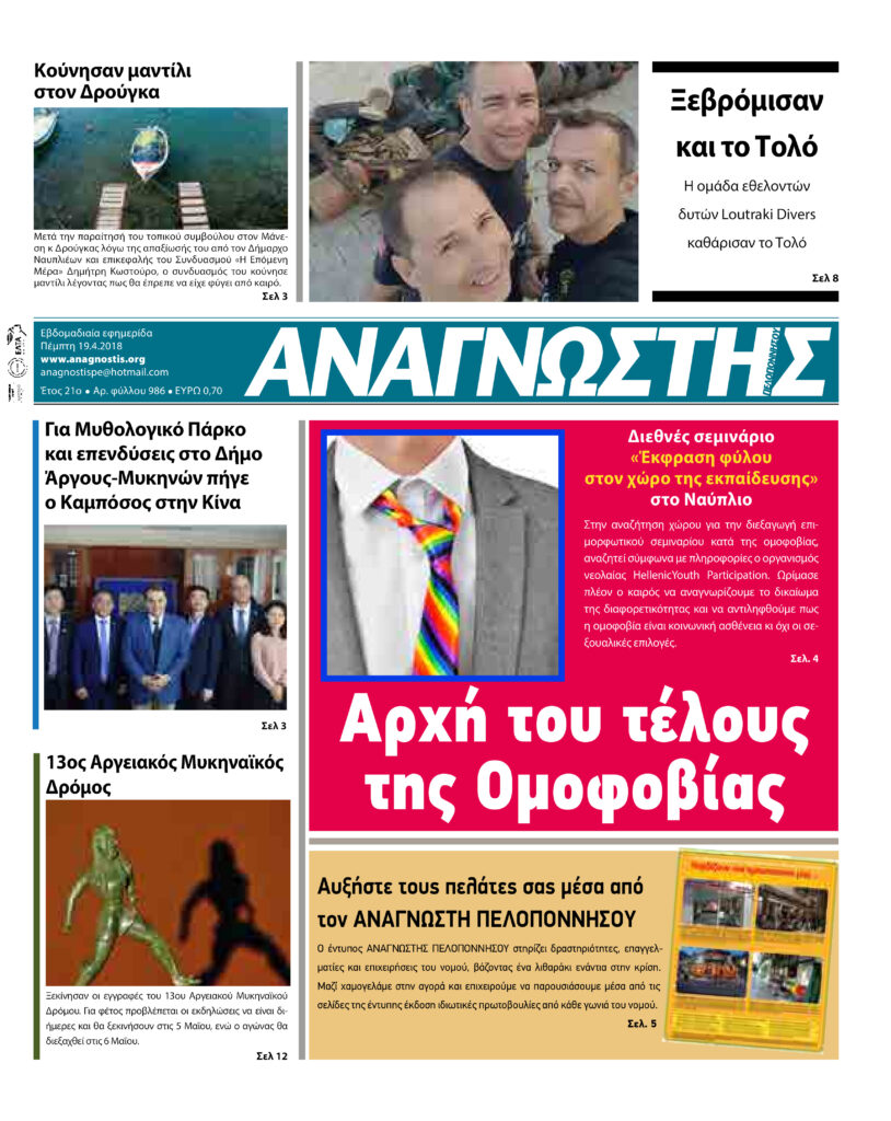 To Τεύχος 986 της εβδομαδιαίας εφημερίδας Αναγνώστης Πελοποννήσου με έδρα το Ναύπλιο του Νομού Αργολίδας που εκδόθηκε και κυκλοφόρησε την Πέμπτη 19 Απριλίου 2018